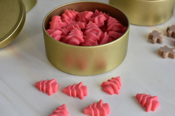 Wax melts en forma de galleta de jengibre y árbol de Navidad.