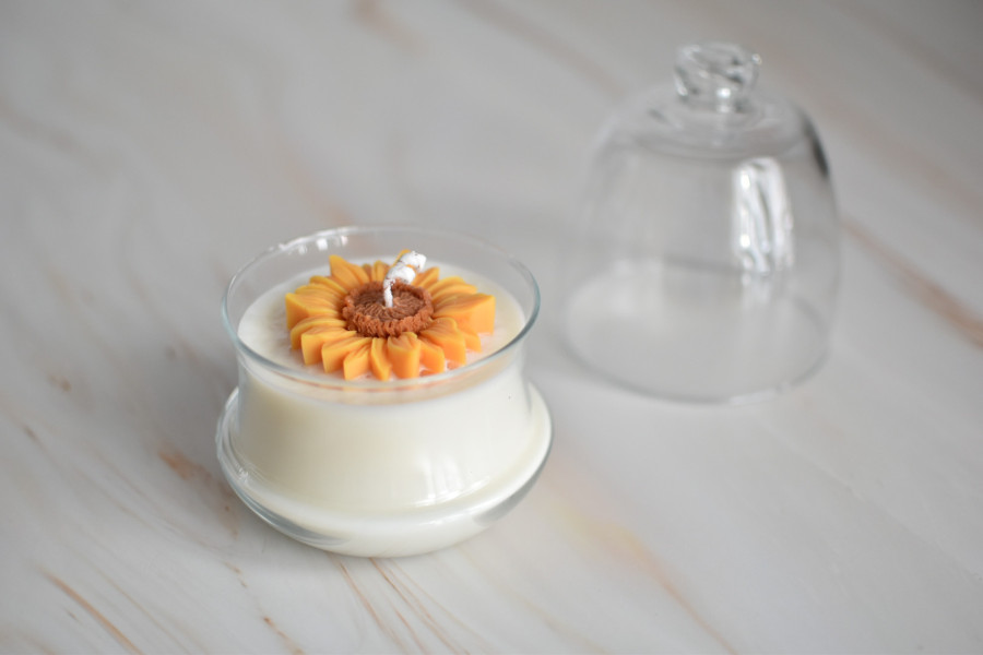 200 Gramos de Cera vegetal de Soja decorada con un girasol hecho en cera.