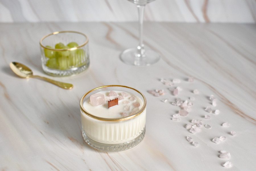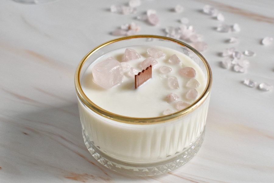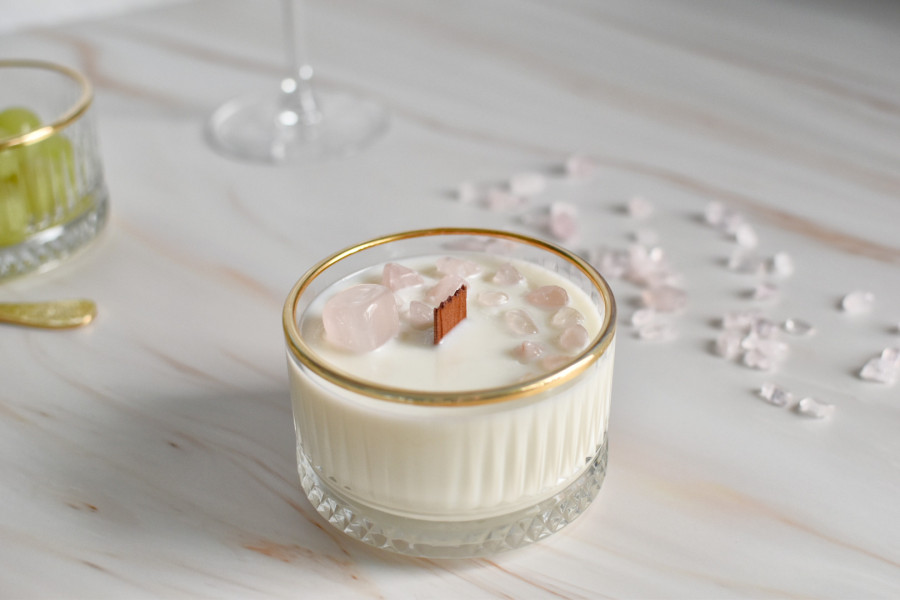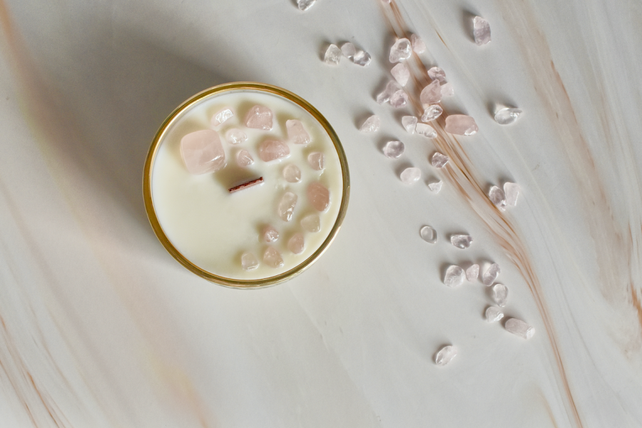 200 Gramos de Cera de Soja decorada con un cristal de Cuarzo Rosa y chips.