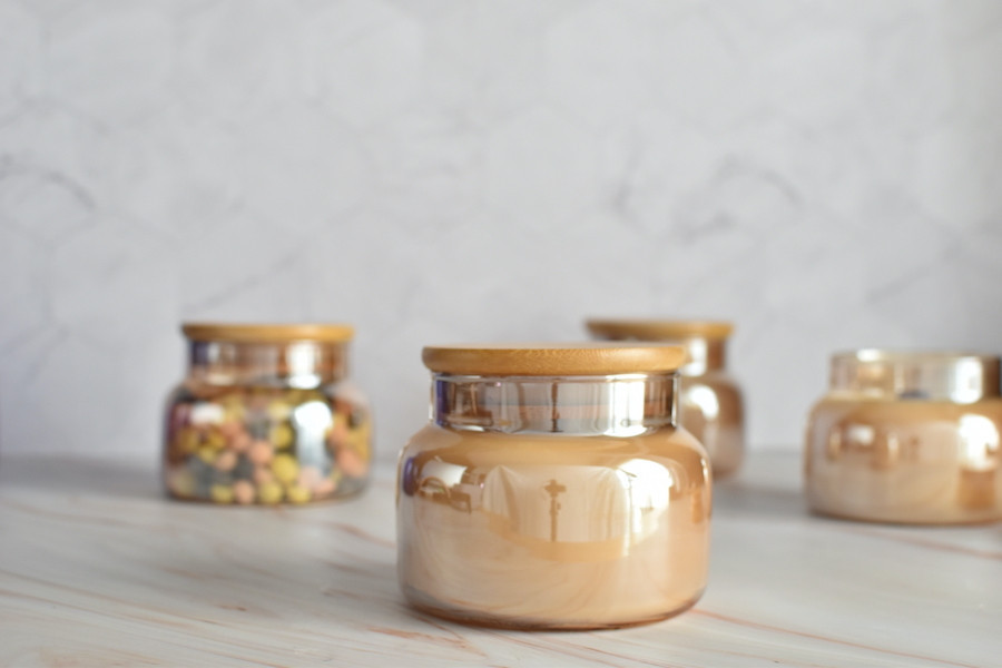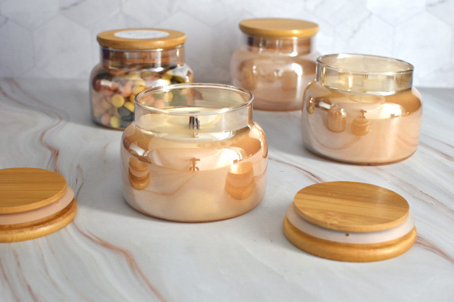 Vela en tarro de boticario en vidrio color ámbar y con tapa hermética de madera.