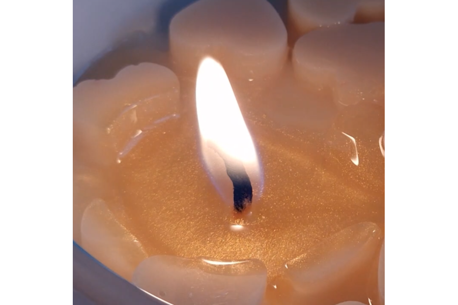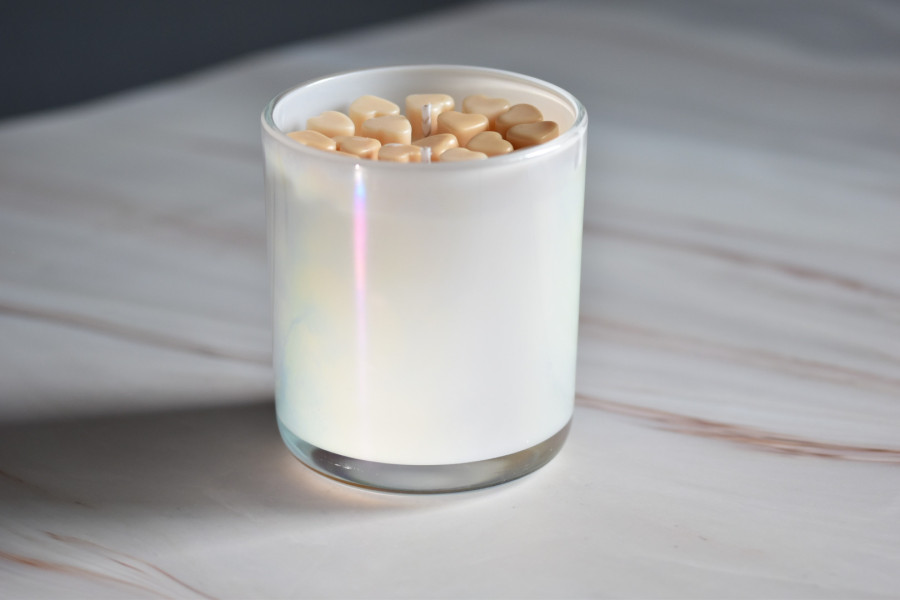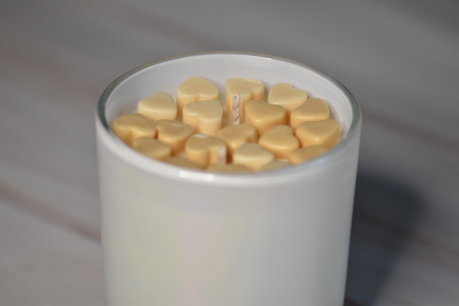 350 Gramos de Cera de Soja decorada con corazones en colores claros que al fundirse lucirá sus brillos.