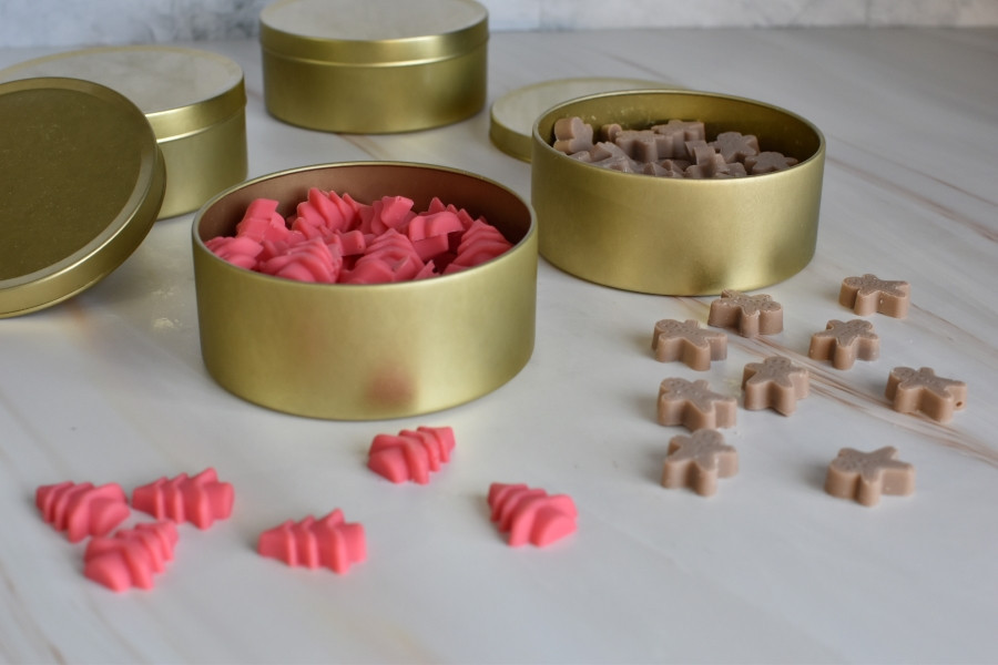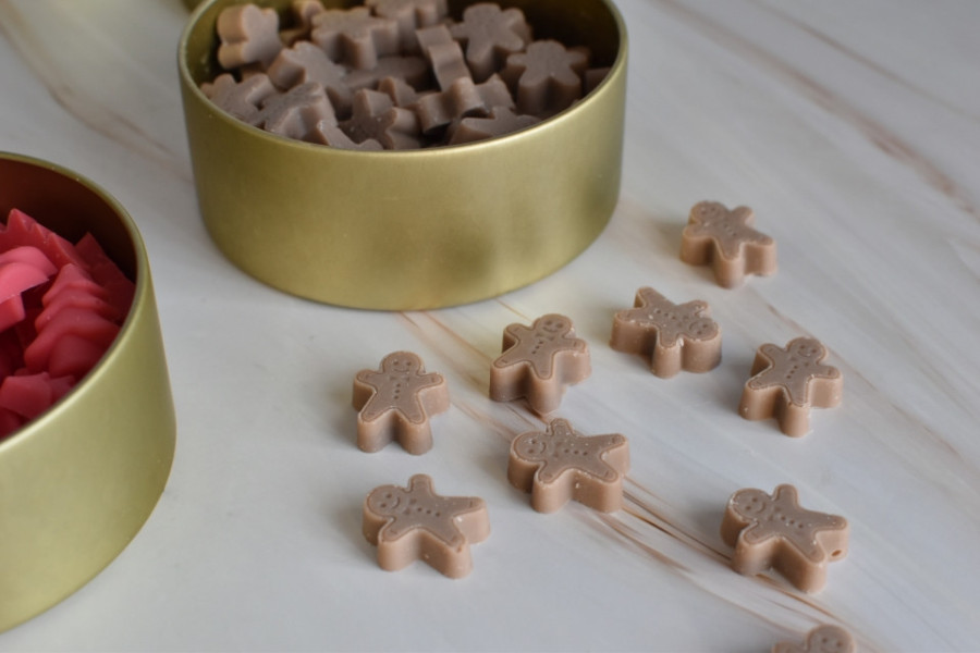 Wax melts en forma de galleta de jengibre y árbol de Navidad.