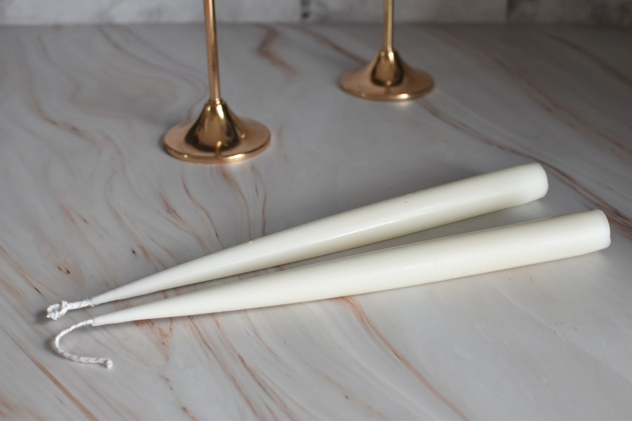 El tamaño de la vela Cónica es de 25cm de alto, 2 cm de base y 50 gramos aproximados.
