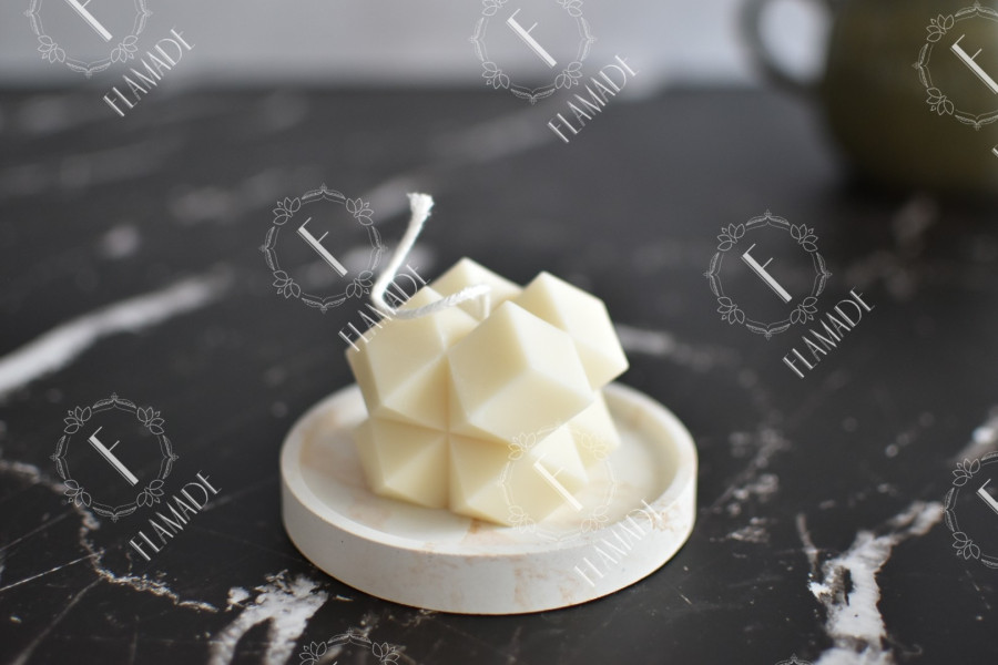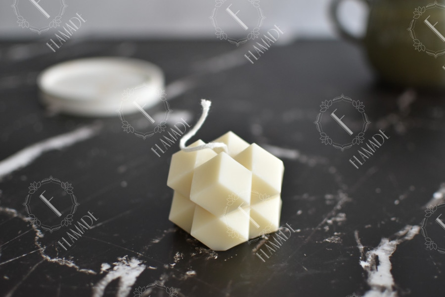 El tamaño de la vela Romboide es de 5,5cm de alto, 6cm de ancho y 90 gramos aproximados.